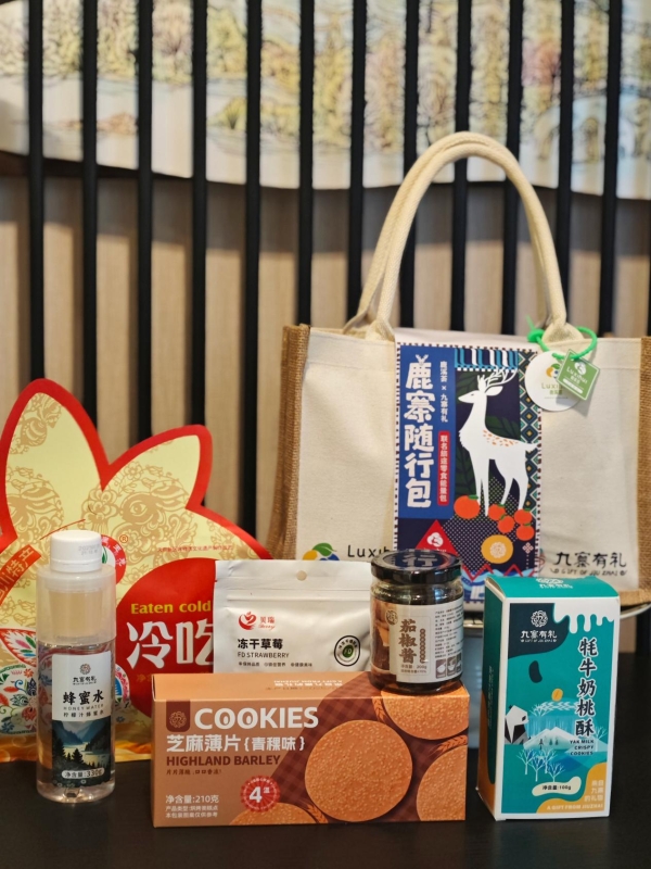 近日,天府新区农产品区域公用品牌鹿溪荟与九寨沟特色礼品品牌九寨有礼创新推出“鹿寨随行包”,这款联名产品将两地特色美食完美融合,为游客带来全新的味觉体验。产品精选六大特色美食:采用国家地理标志产品竹丝茄制作的茄椒酱、成都特色冷吃兔、酸甜可口的草莓冻干,以及九寨特色的蜂蜜水、牦牛奶桃酥和青稞味芝麻薄片。这款随行包充分考虑了游客需求,实现“一包在手,游遍九寨”的便捷体验,让游客在欣赏自然美景的同时,也能享受两地美食文化的交融。