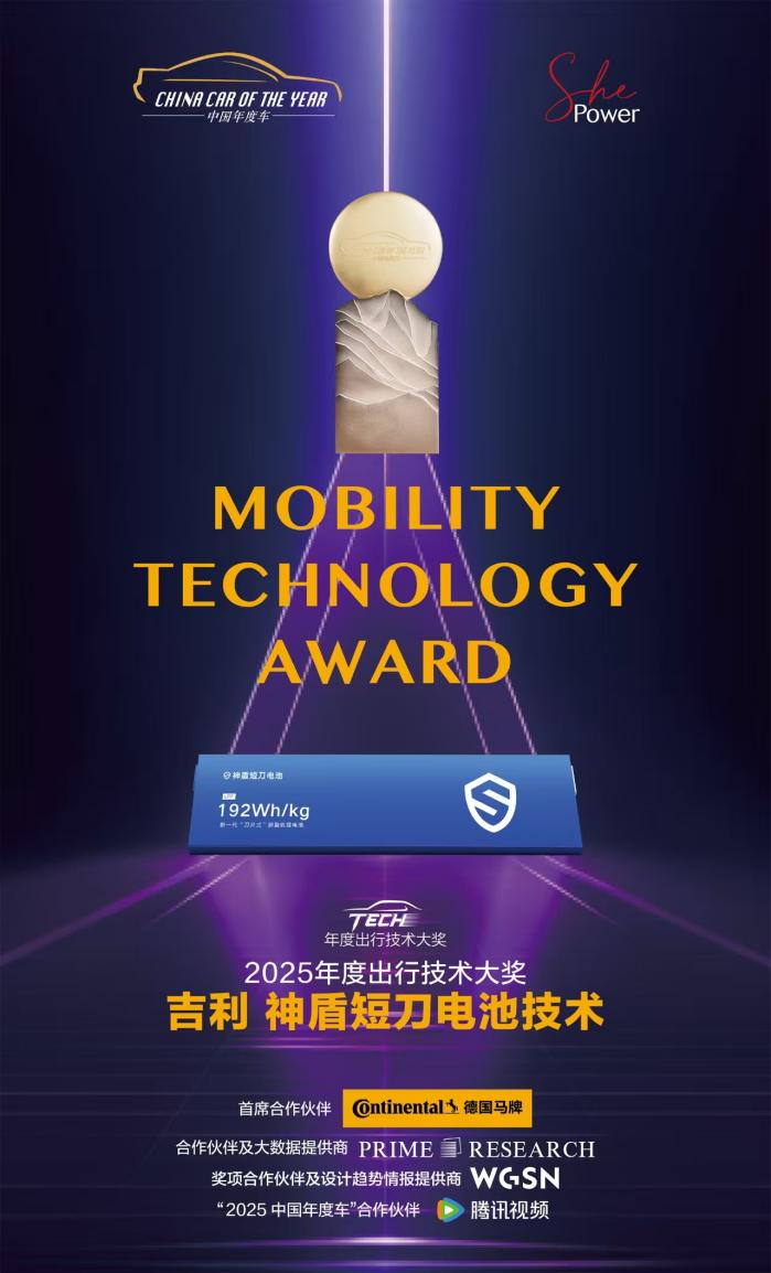 12月10日,“2025中国年度车”评选颁奖典礼正式举行。经过由48位专业汽车媒体人组成的权威评委团队严格测试、审核后,吉利自研、自产的神盾短刀电池荣获“2025中国年度出行技术大奖”,与华为乾崑智驾(HUAWEI ADS)成为唯二获此殊荣的行业顶尖技术,更击败宁德时代骁遥超级增混电池,成为是行业内唯一获得此奖项的电池品牌。同时,首搭神盾短刀电池的吉利银河E5也在此次评选中以195分的高分,荣获“2025中国年度预算型车”奖项。